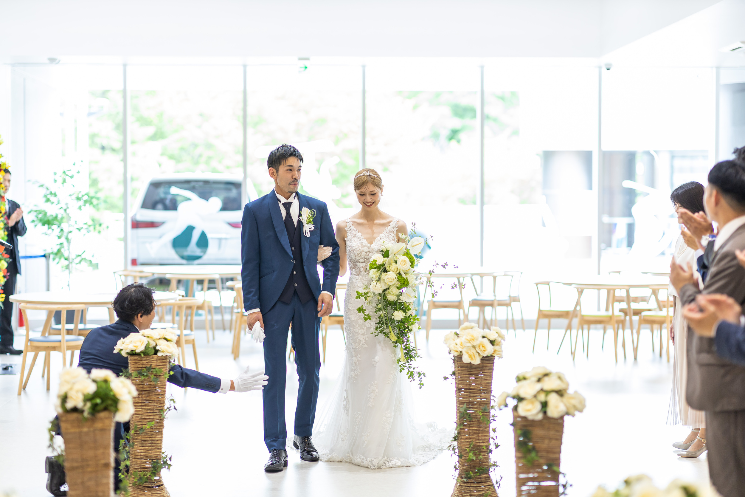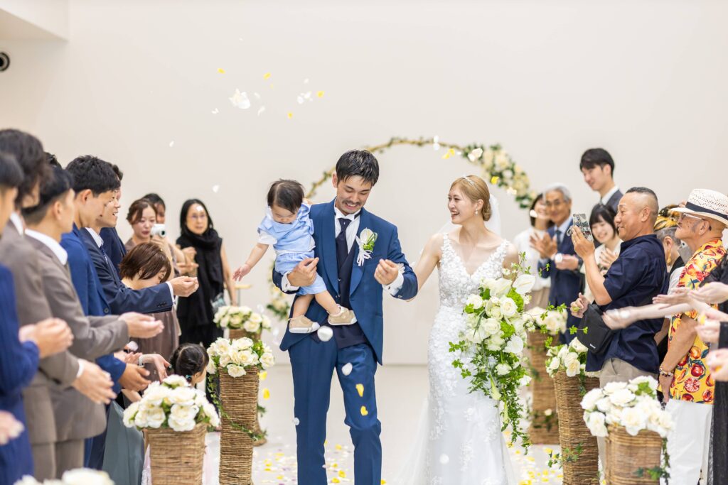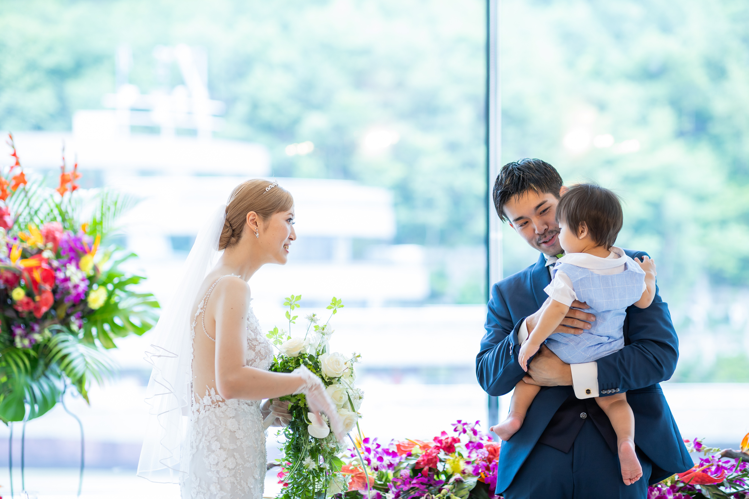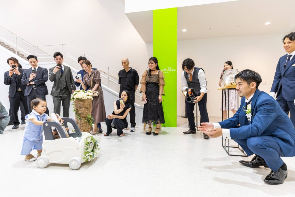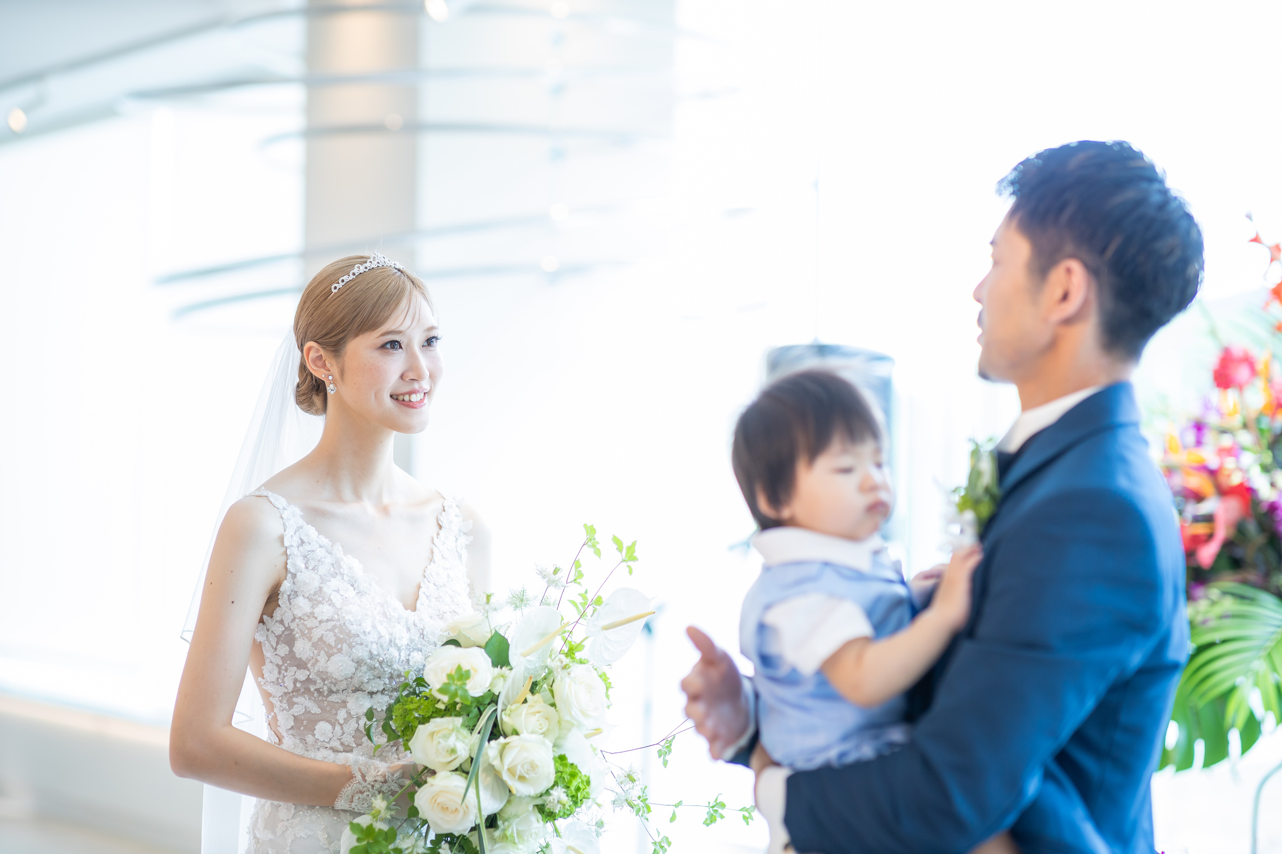 ヌーベルプース大倉山1階の白を基調とした式場で人前式を執り行いましたおふたりのお子様がご新郎様に好きな車を押してリングボーイをがんばってくれたりととても明るく和やかな式となりました