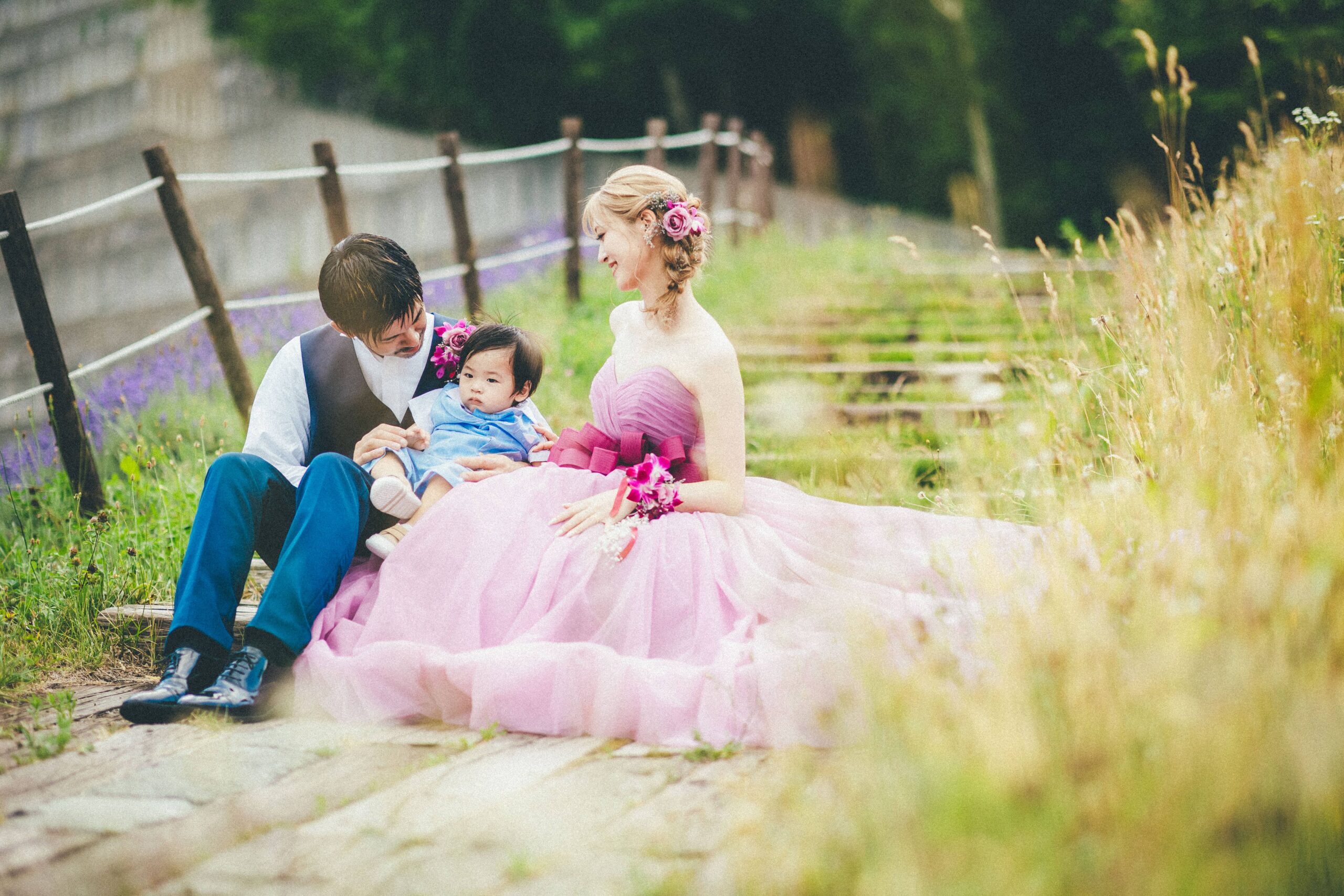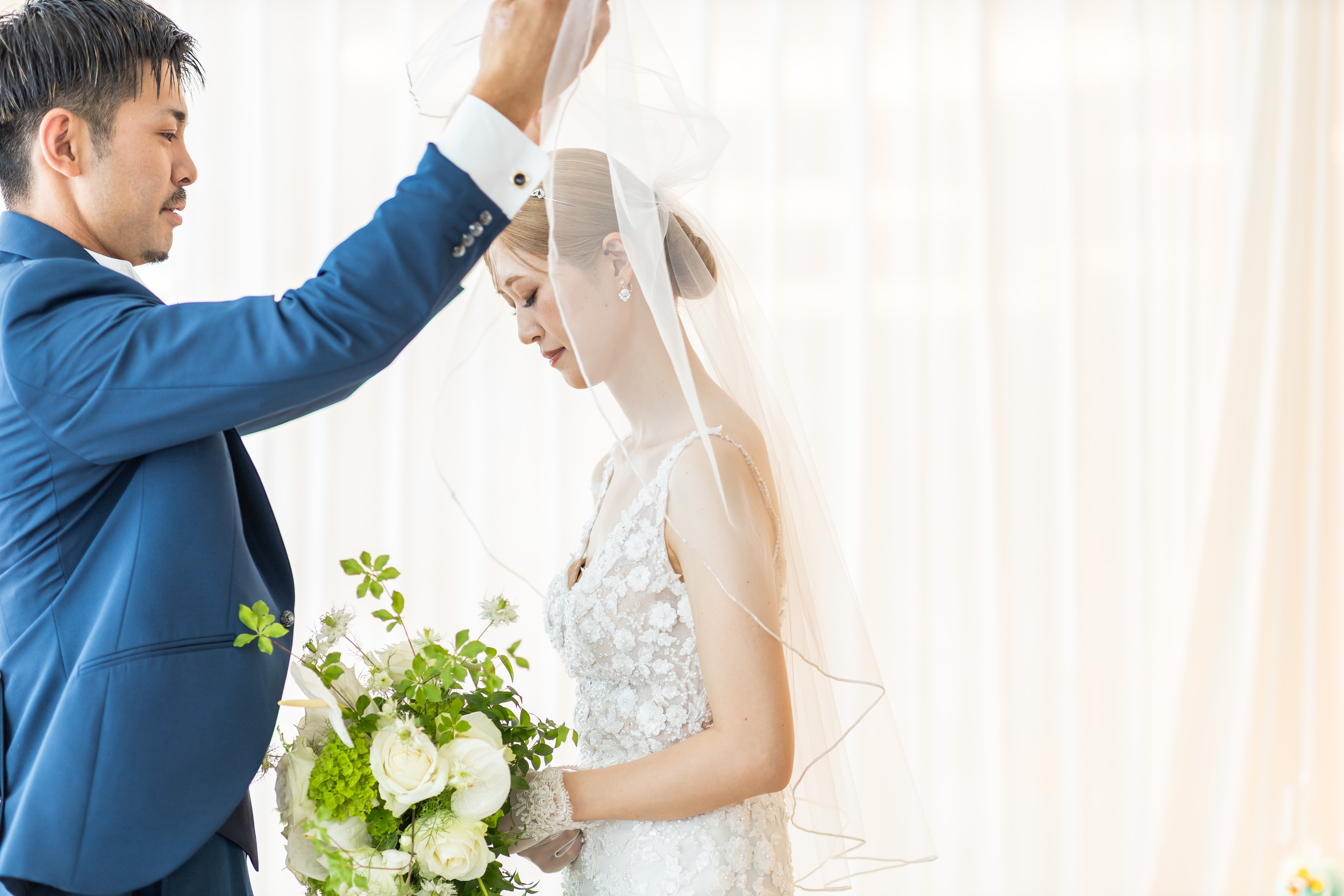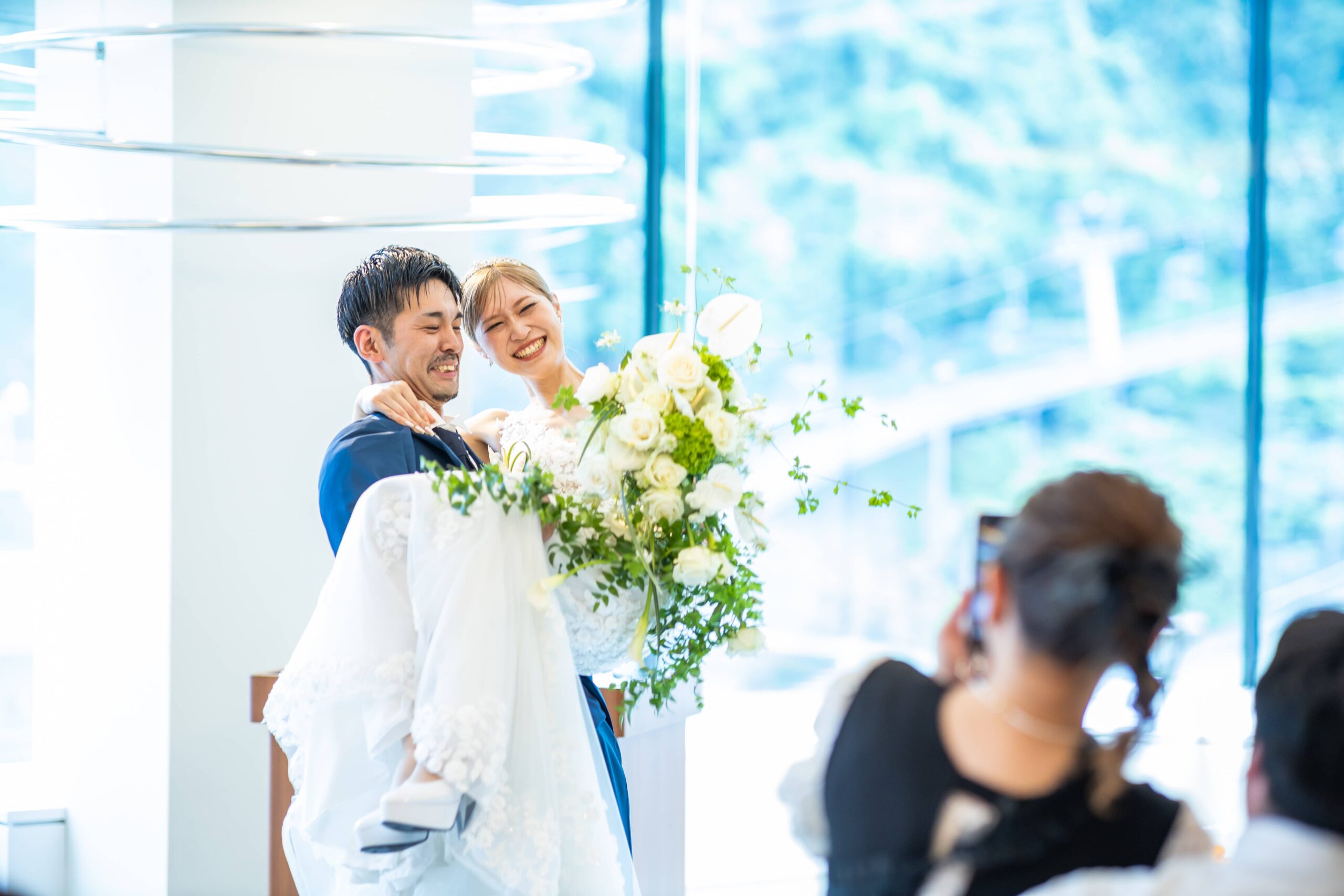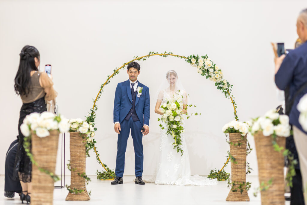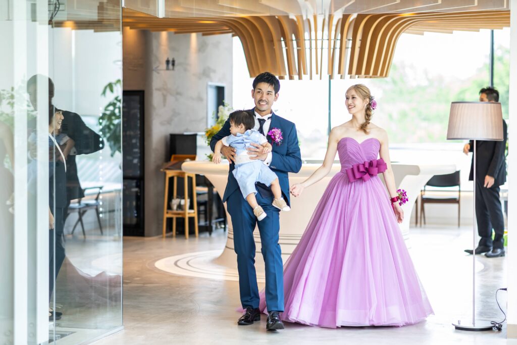 ヌーベルプース大倉山1階の白を基調とした式場で人前式を執り行いましたおふたりのお子様がご新郎様に好きな車を押してリングボーイをがんばってくれたりととても明るく和やかな式となりました