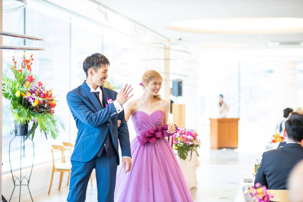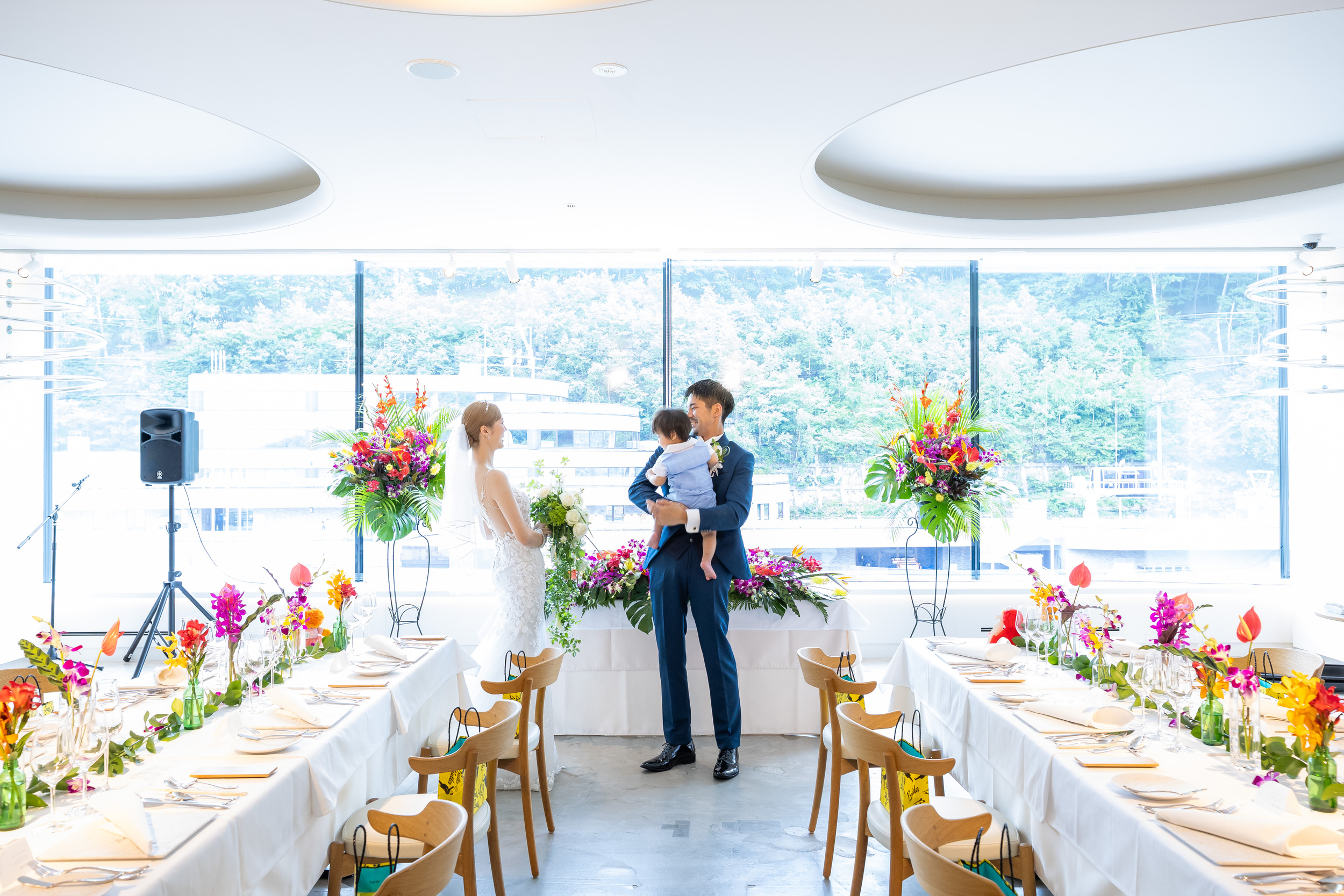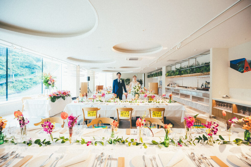 ウエディングパーティーは夏らしいカラーをたくさん使用したフラワーコーディネートで会場を明るく華やかにゲストもお二人も初めからおひらきまで笑顔が絶えない時間となりました