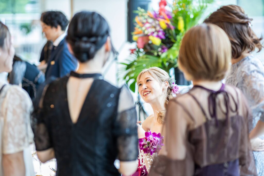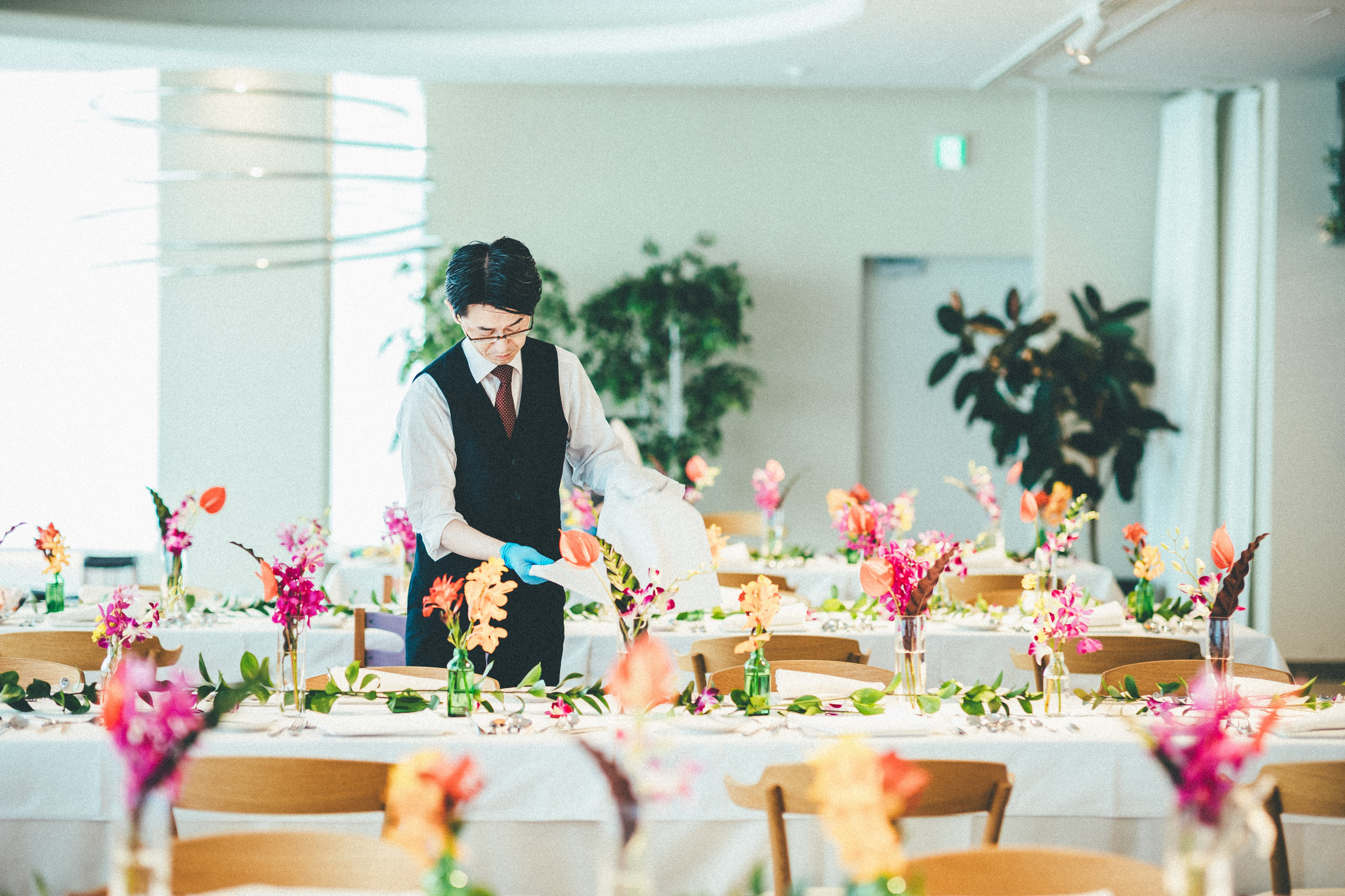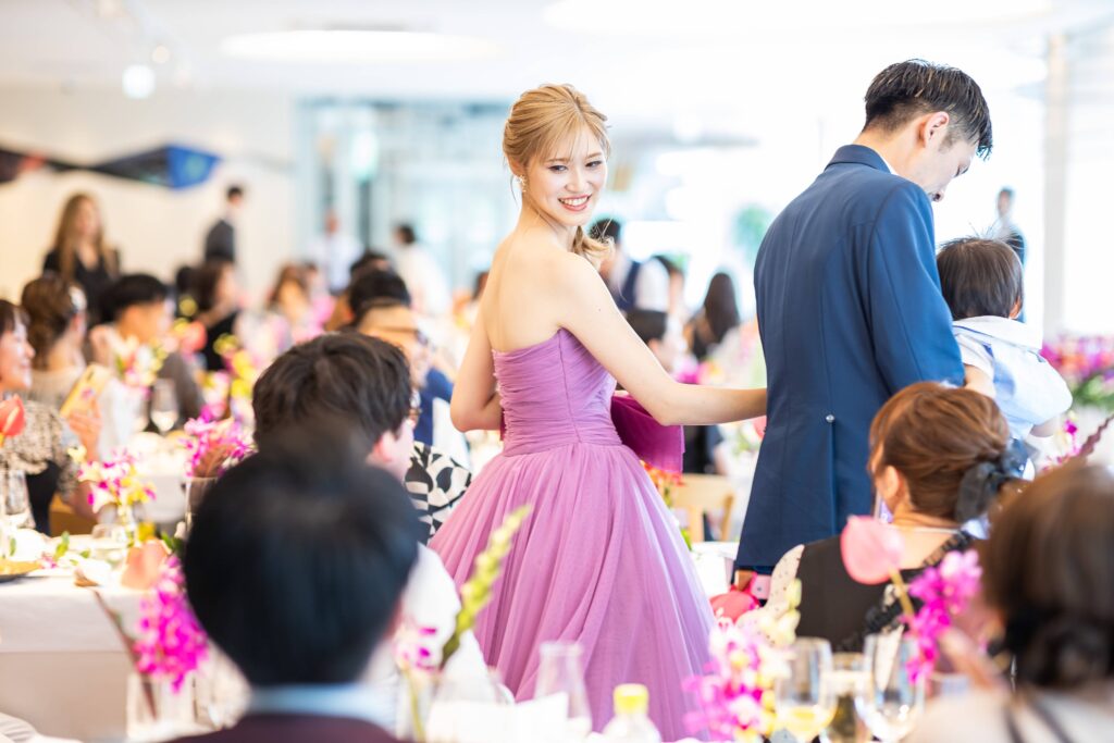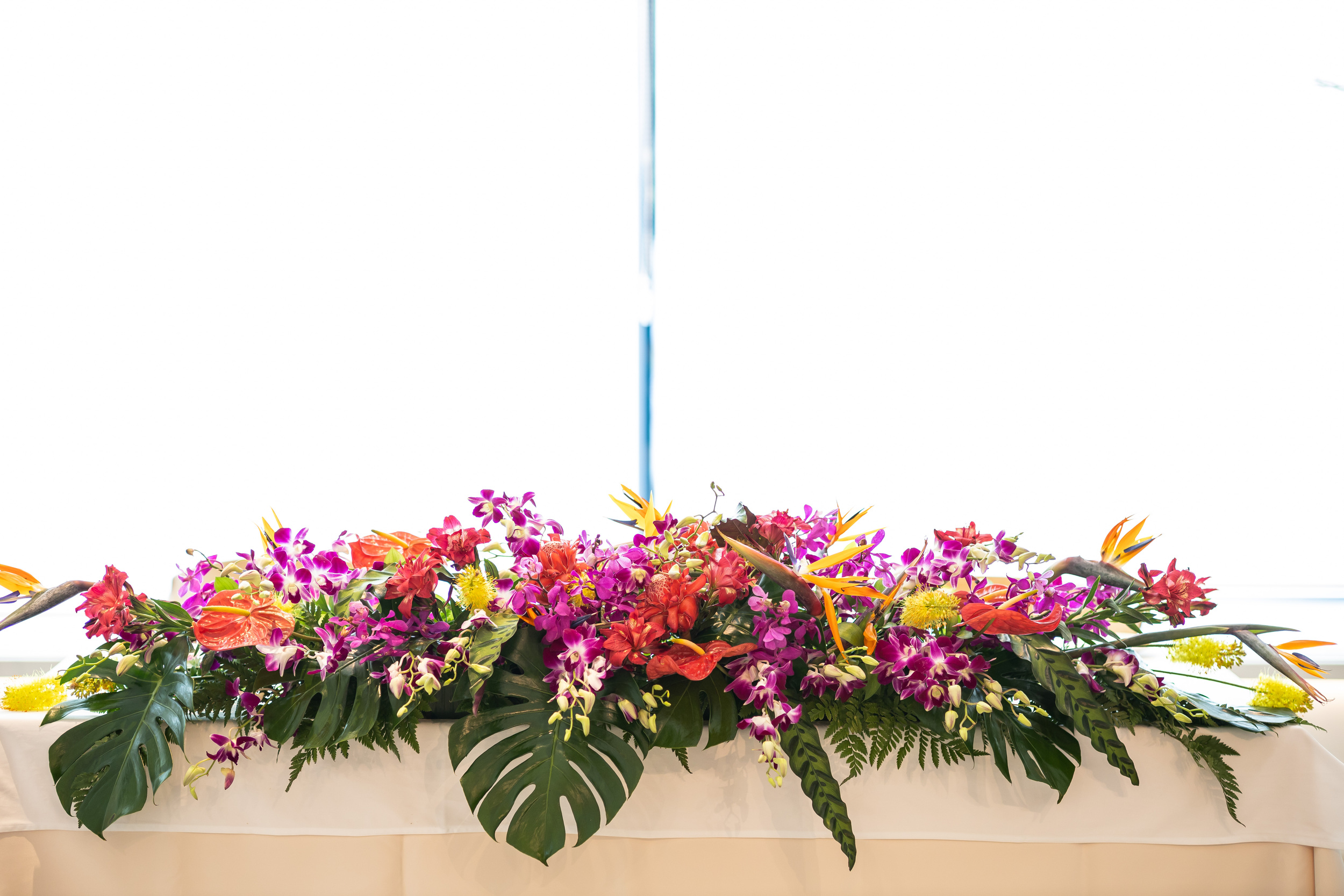ウエディングパーティーは夏らしいカラーをたくさん使用したフラワーコーディネートで会場を明るく華やかにゲストもお二人も初めからおひらきまで笑顔が絶えない時間となりました