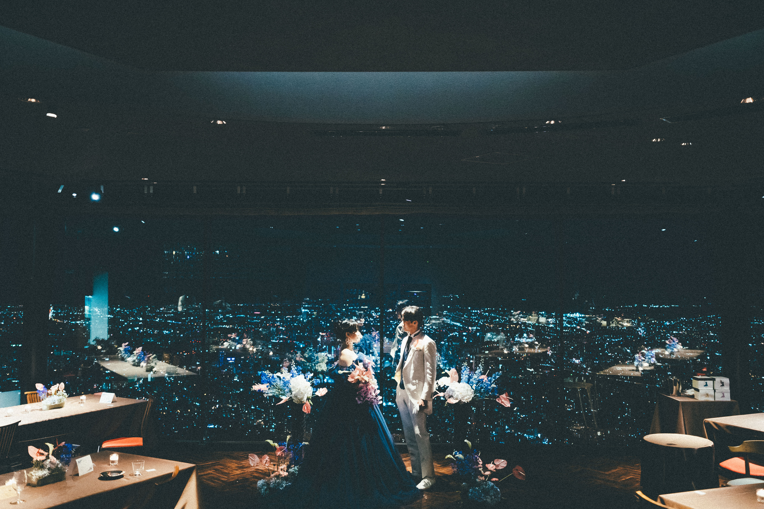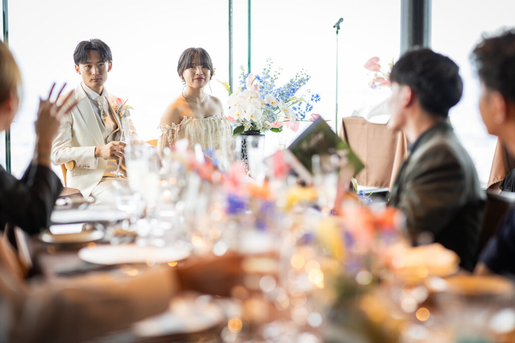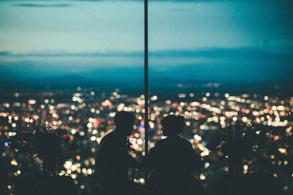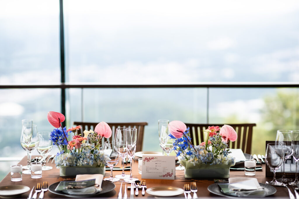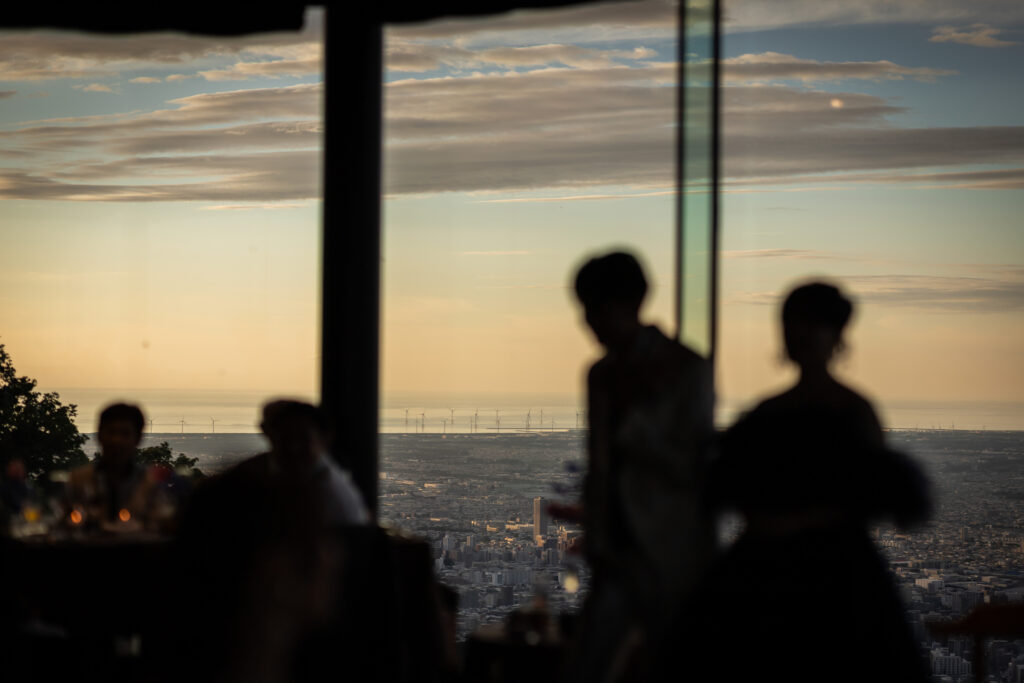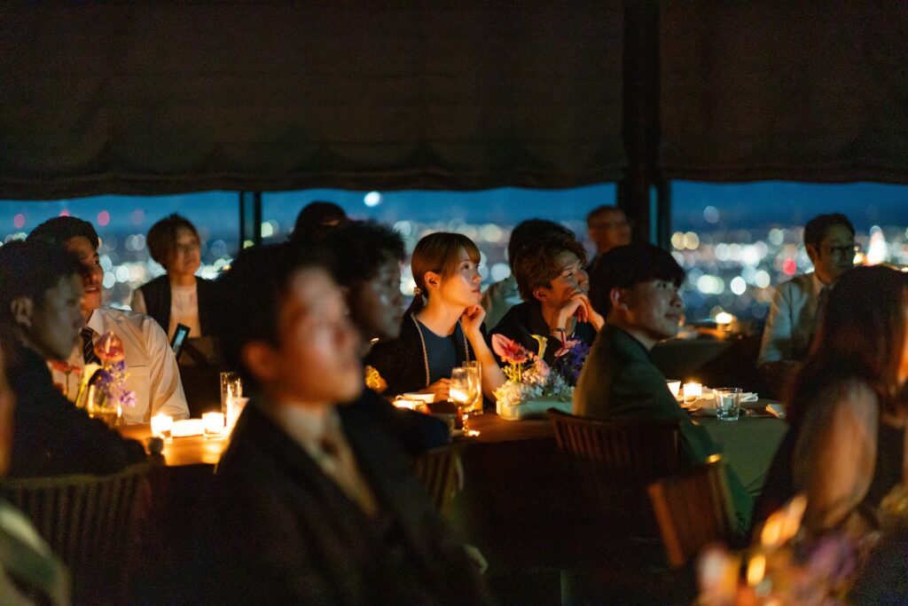 挙式を行った後はゲストの皆さんにケーブルカーにて山頂へ移動しパーティー開始時間まで展望台やファーストドリンクでお待ちいただきましたお二人の手作りのテーブルカードや色鮮やかなフラワーコーディネート日中の明るさから時間と共に表情を変えパーティー締めくくりには最高の夜景へお二人の周りに皆さんが集まりフォト撮影をするのなど入場からおひらきまで楽しい時間となりました