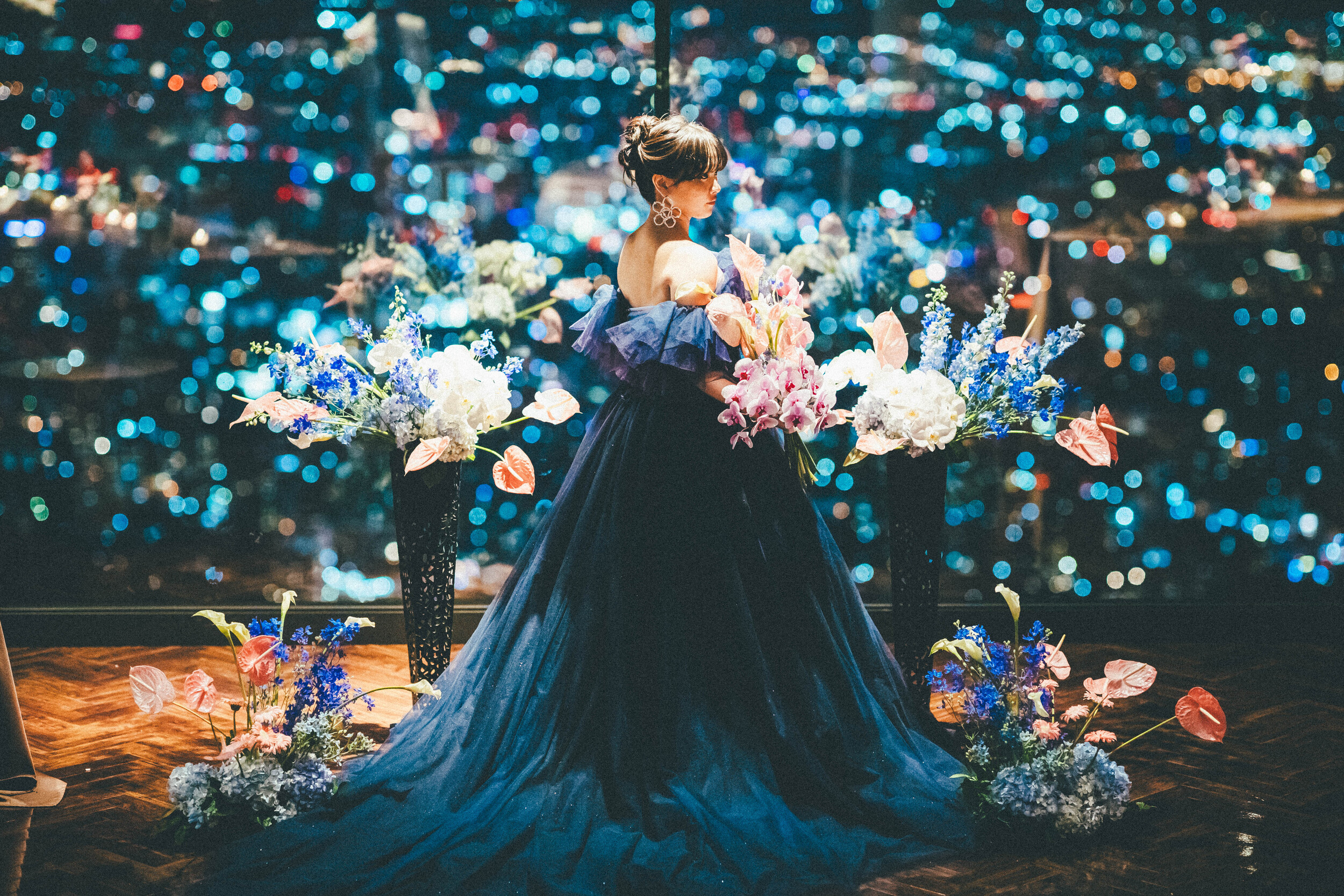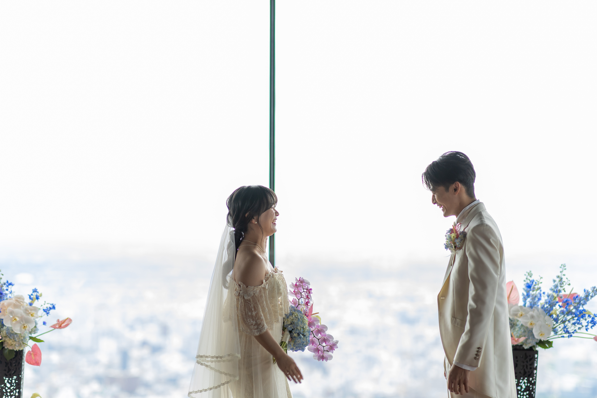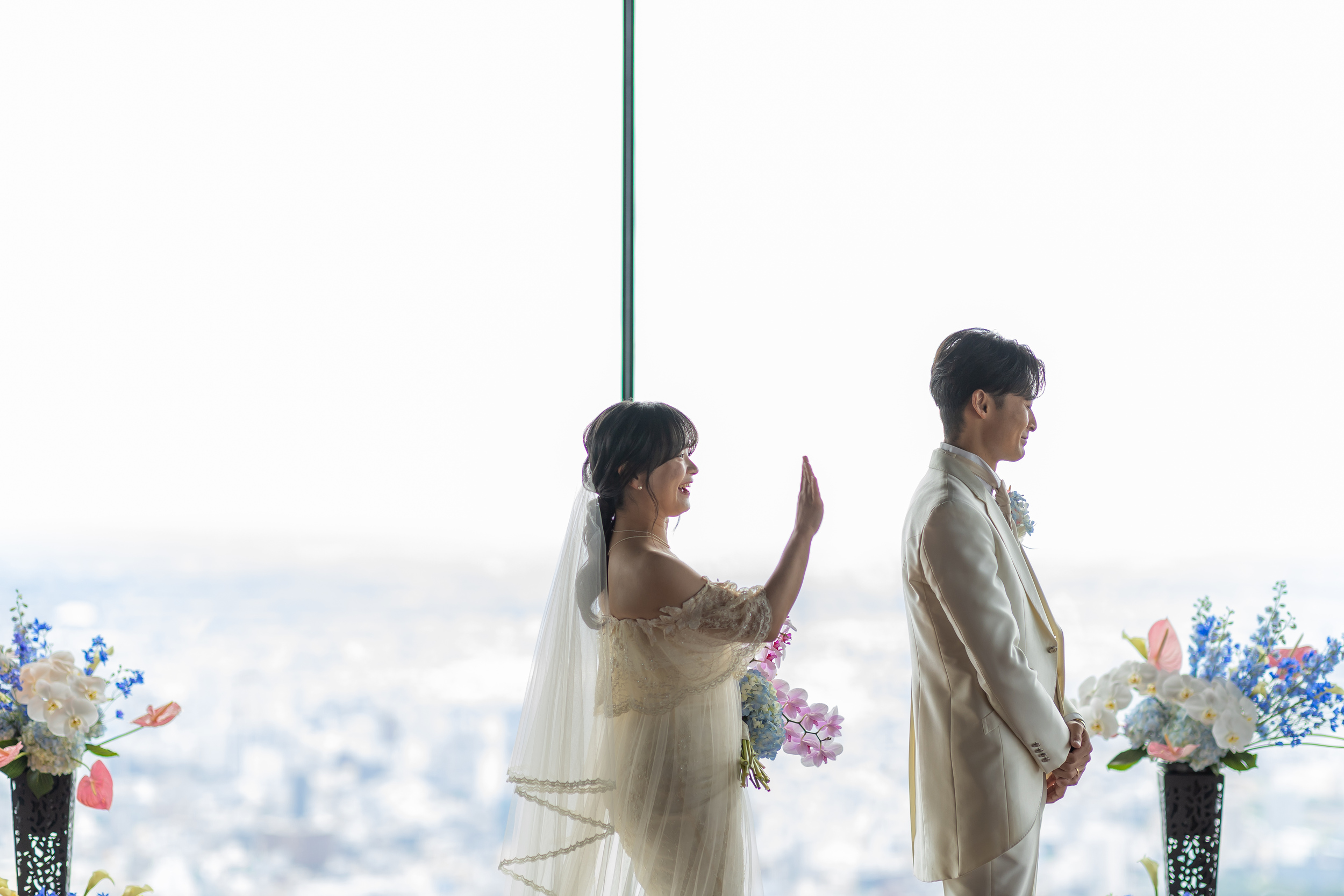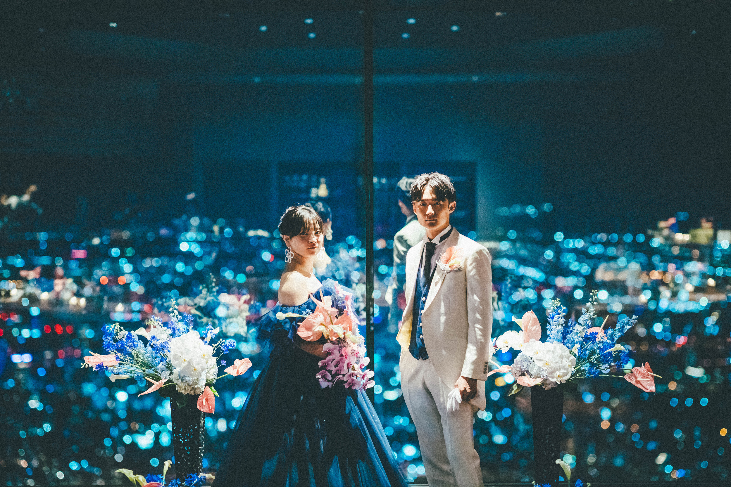 挙式を行った後はゲストの皆さんにケーブルカーにて山頂へ移動しパーティー開始時間まで展望台やファーストドリンクでお待ちいただきましたお二人の手作りのテーブルカードや色鮮やかなフラワーコーディネート日中の明るさから時間と共に表情を変えパーティー締めくくりには最高の夜景へお二人の周りに皆さんが集まりフォト撮影をするのなど入場からおひらきまで楽しい時間となりました