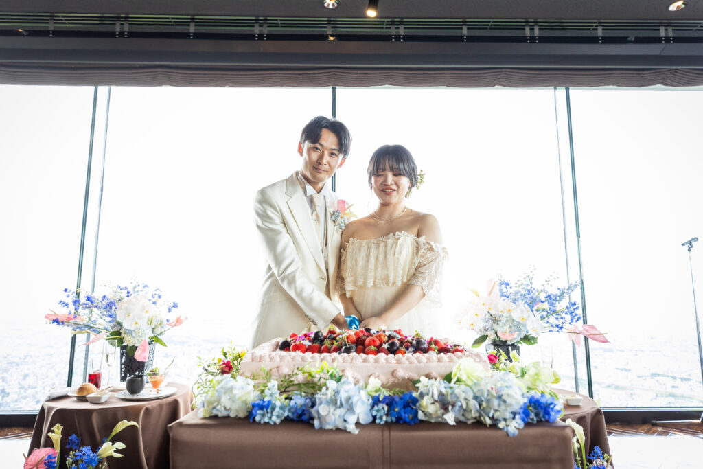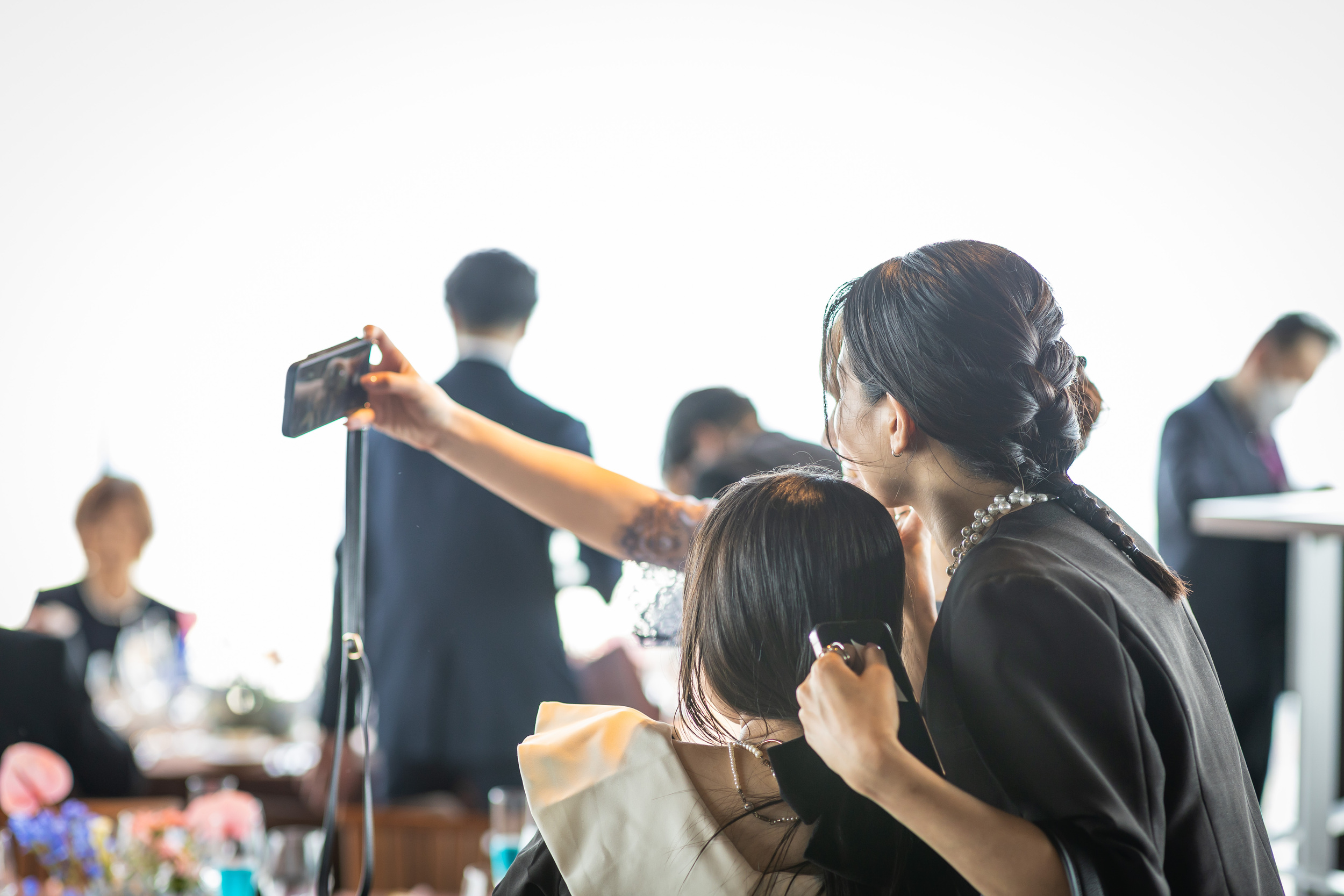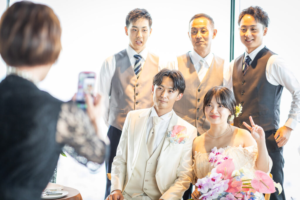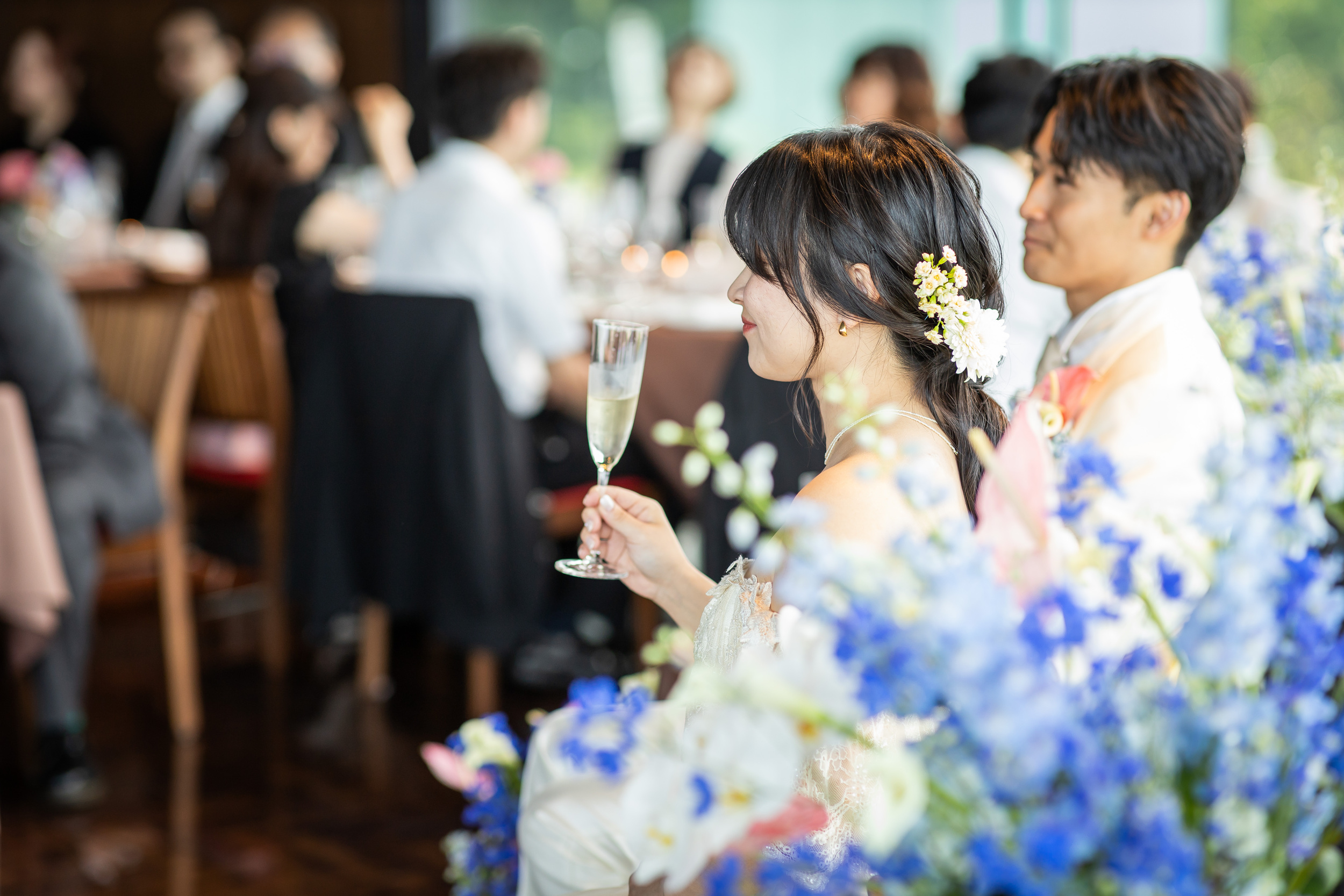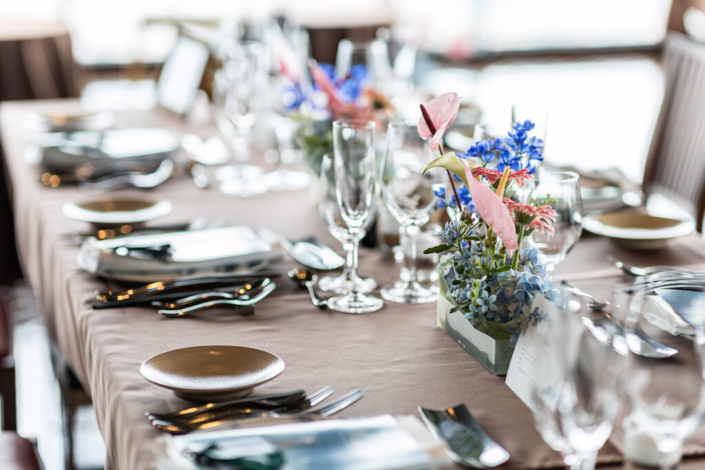 挙式を行った後はゲストの皆さんにケーブルカーにて山頂へ移動しパーティー開始時間まで展望台やファーストドリンクでお待ちいただきましたお二人の手作りのテーブルカードや色鮮やかなフラワーコーディネート日中の明るさから時間と共に表情を変えパーティー締めくくりには最高の夜景へお二人の周りに皆さんが集まりフォト撮影をするのなど入場からおひらきまで楽しい時間となりました