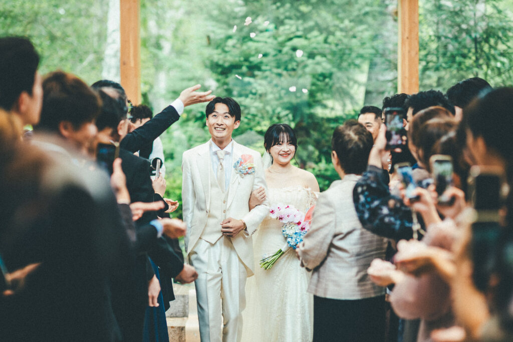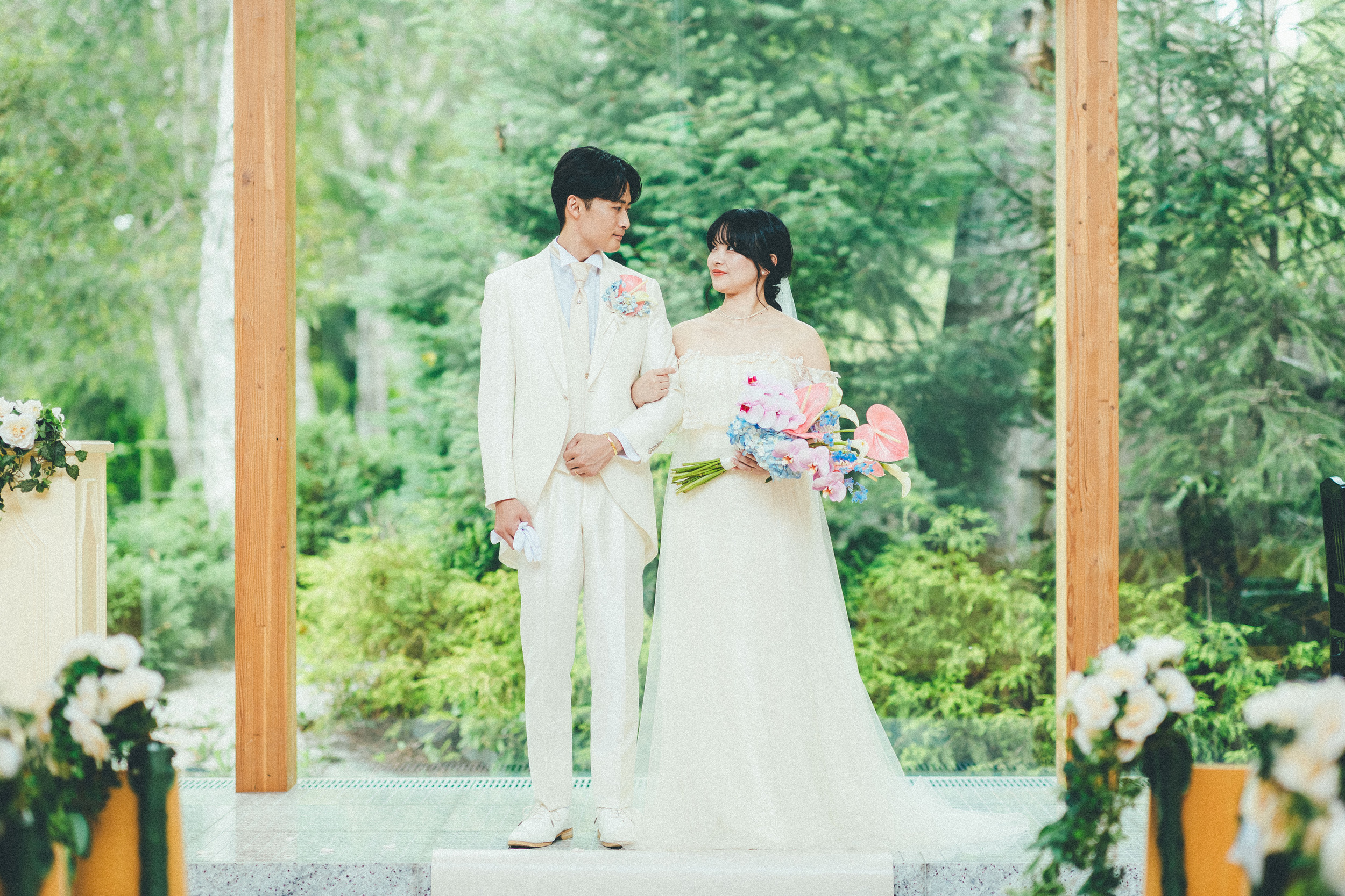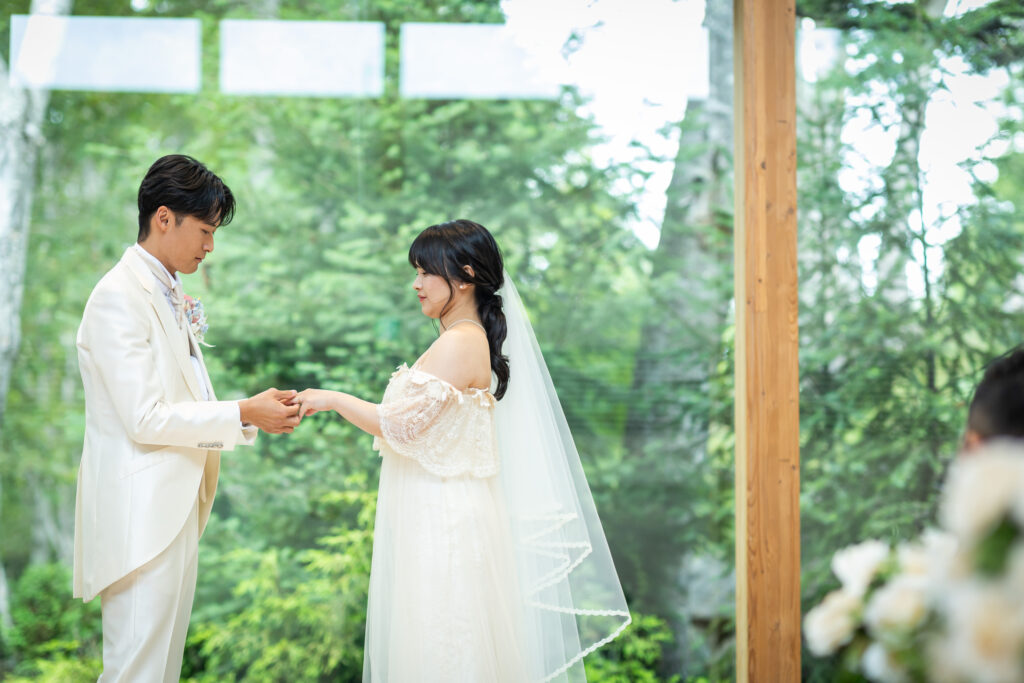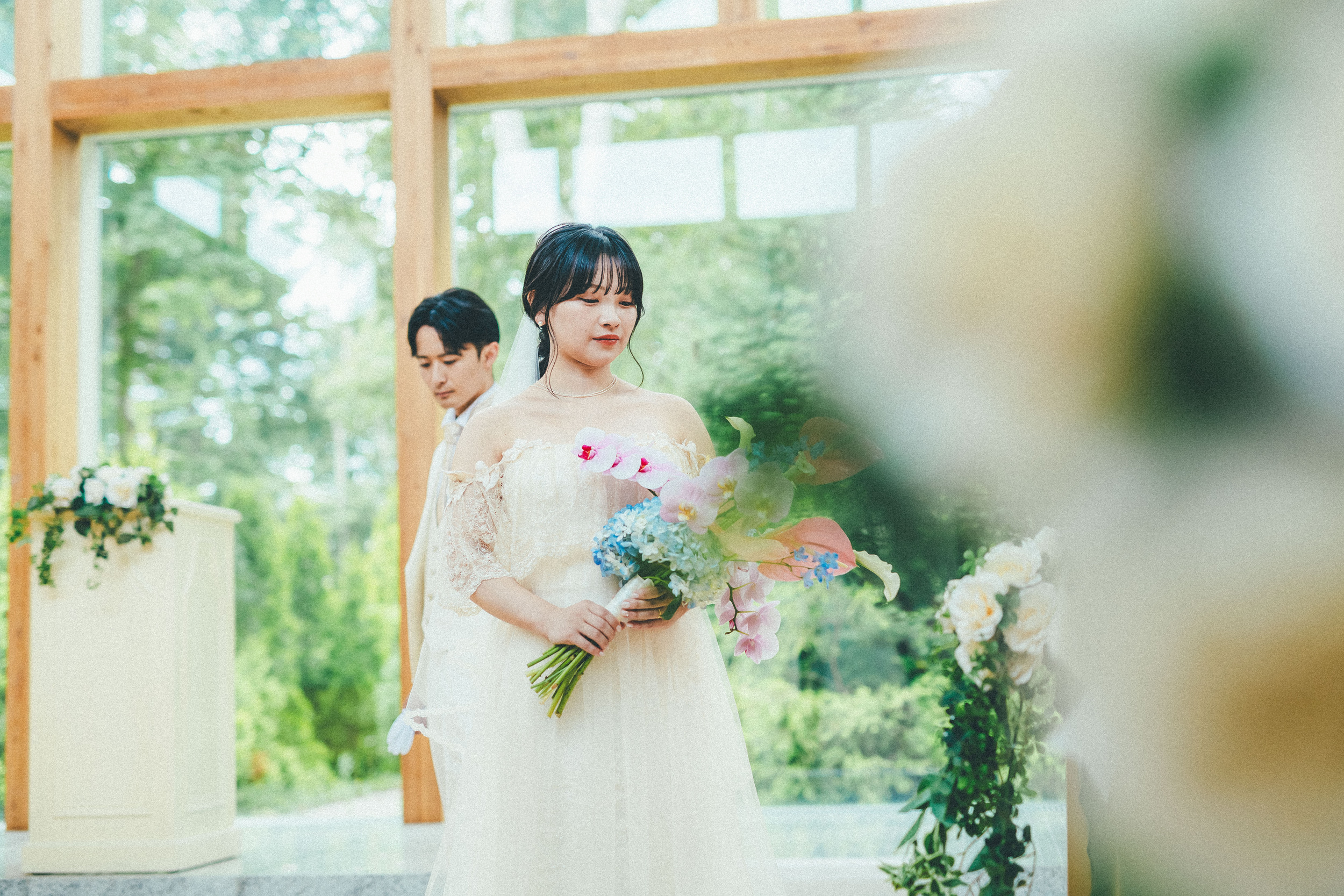 天井からの自然光藻岩山の温もりのある木々たちの色合いそんなナチュラルな空間でおふたりは人前式で結婚式を執り行いました人前式では、ご両親や友人も参加してもらう演出を取り入れるなどとてもステキな時間となりました