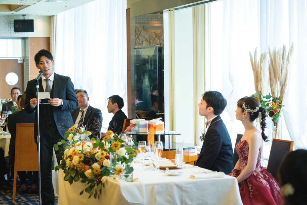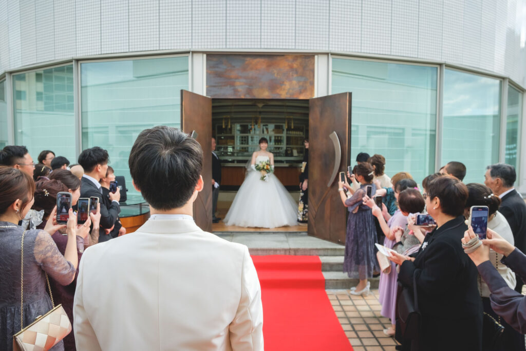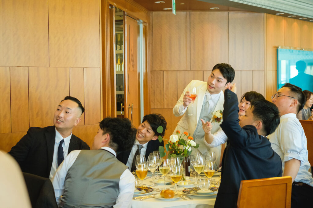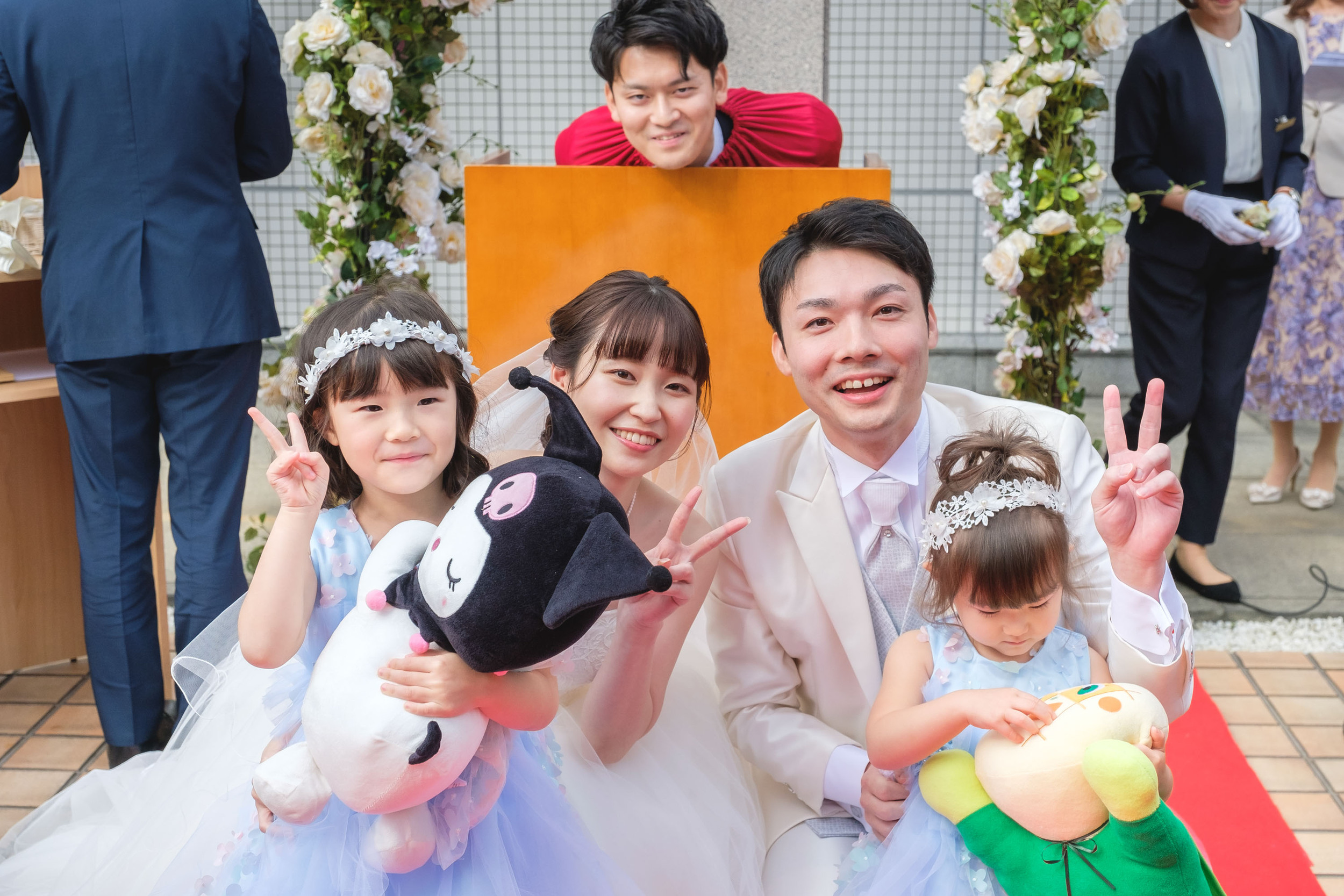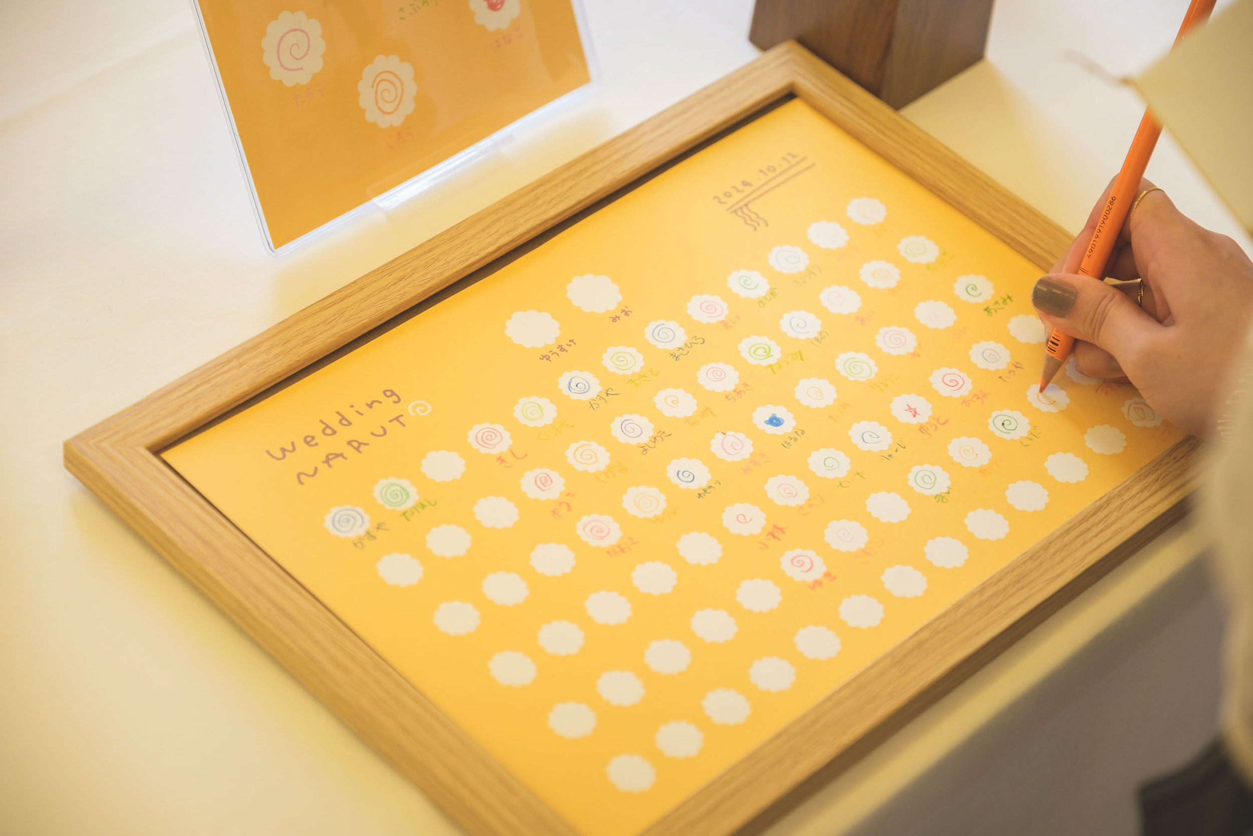 挙式は大切なゲストに見守られる人前式スタイル。新郎友人が赤いマントを纏い「牧師」として登場するサプライズには会場が温かな笑いに包まれました。 お二人の共通の趣味である「ラーメン」にちなみナルトをデザインしたオリジナルの結婚証明書が登場。受付でゲスト全員に署名していただいた世界に一つだけの証明書は、お二人とゲストの絆を象徴するアイテムとなりました。