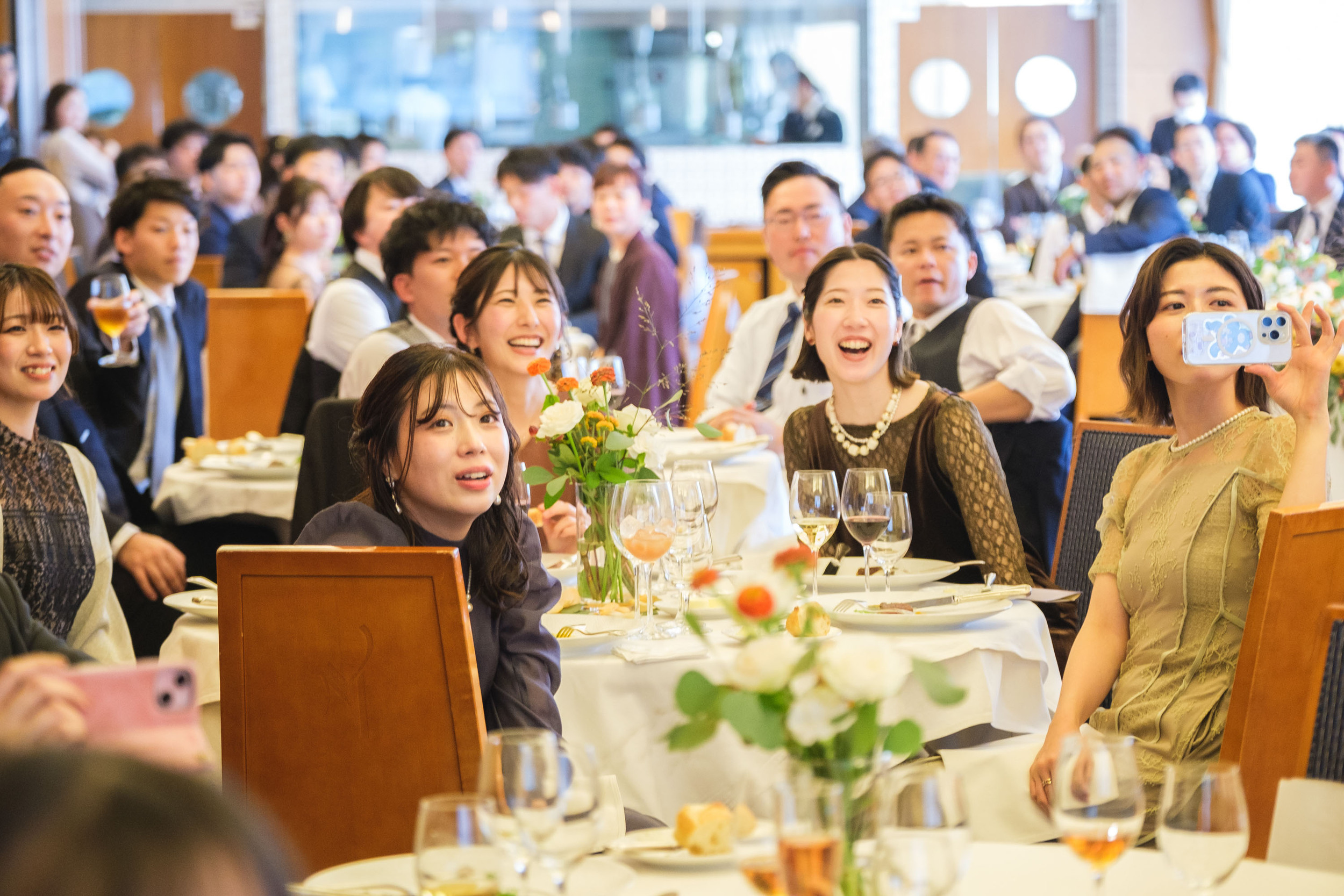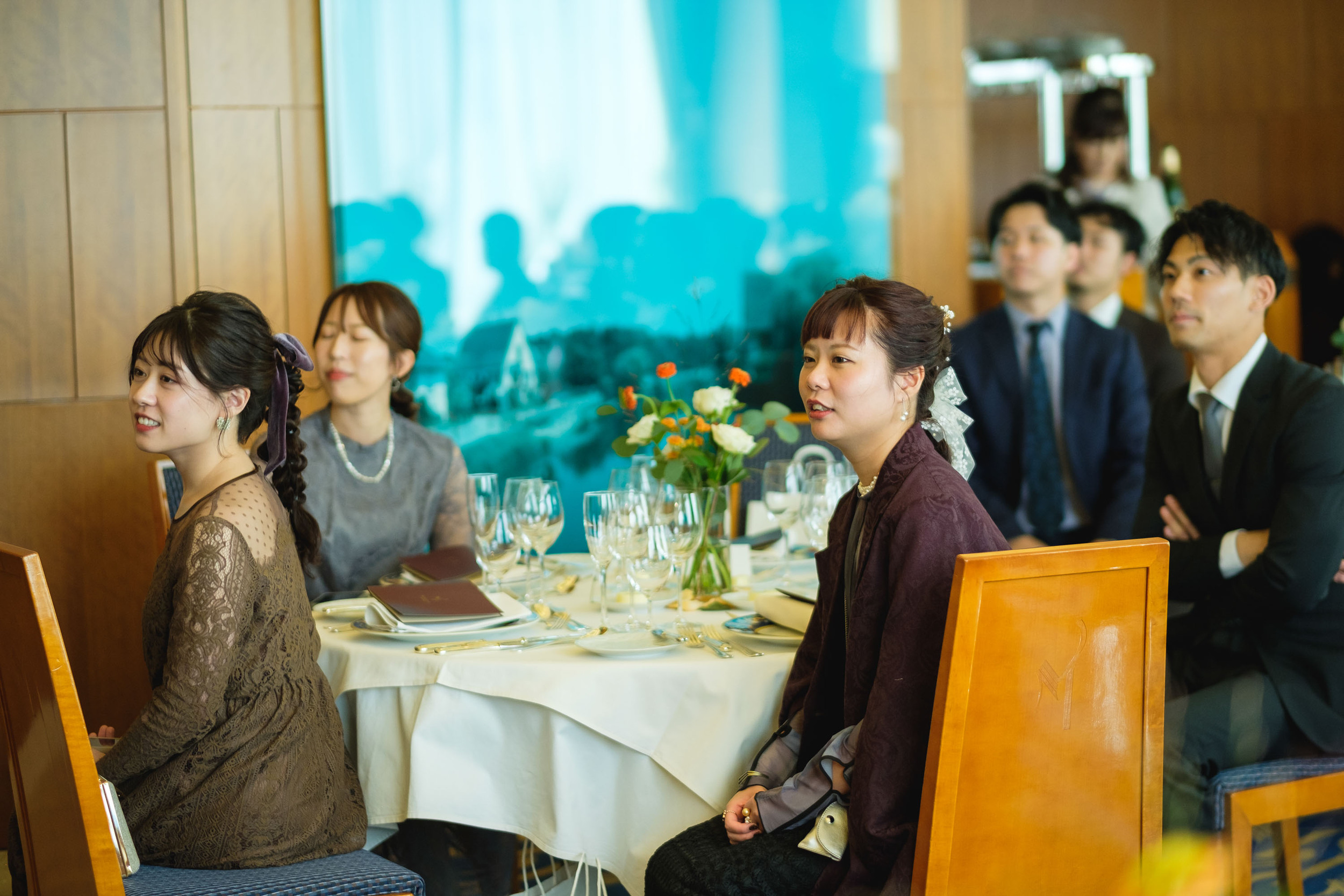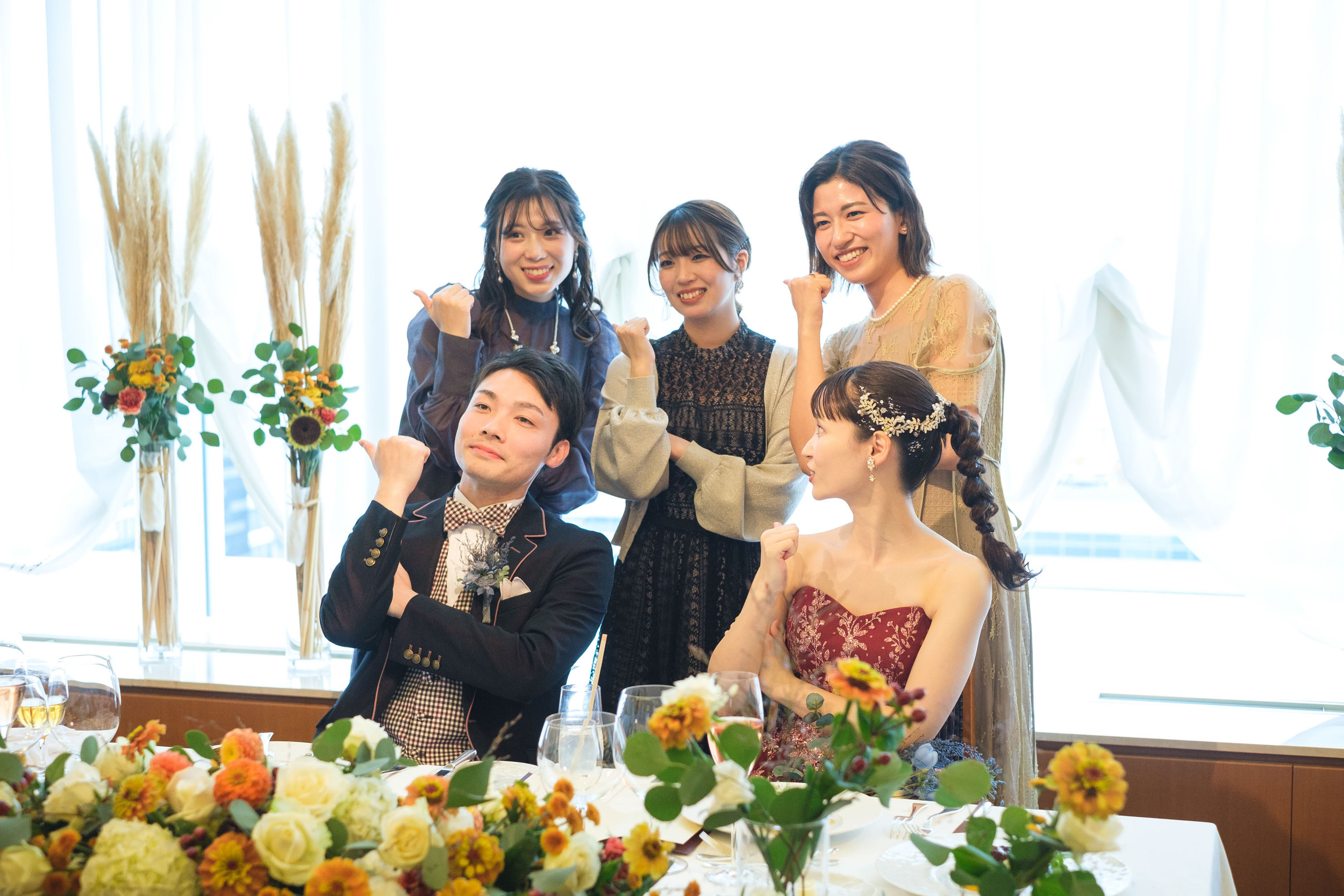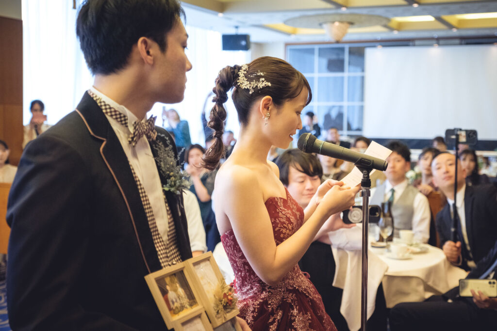 再入場では受付で行って頂いた「ドレス色当てクイズ」の結果発表。鮮やかな赤のドレスで登場したご新婦様に、会場からは大きな歓声が上がりました。 友人代表スピーチでは共に歩んできた時間を思い出し ご新婦様とご友人が涙するシーンも。ご両親へ手作りのフォトフレームに感謝を込めて贈った記念品贈呈。そして当日の様子を撮影し編集した「エンディングシネマ」で会場の心は一つになり 感動の余韻の中でお見送りを迎えました。