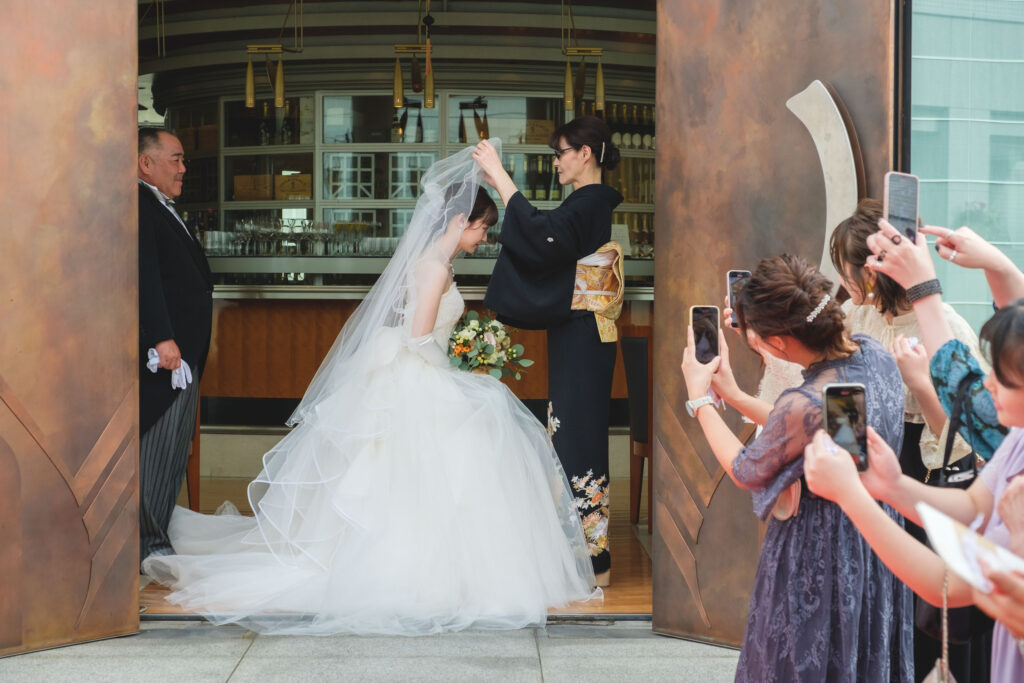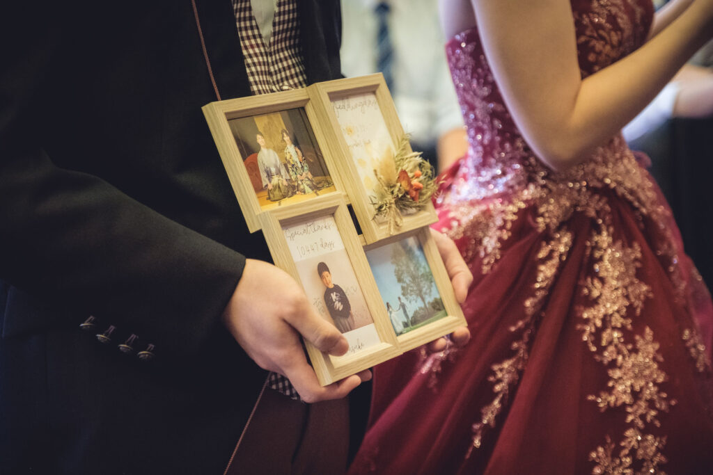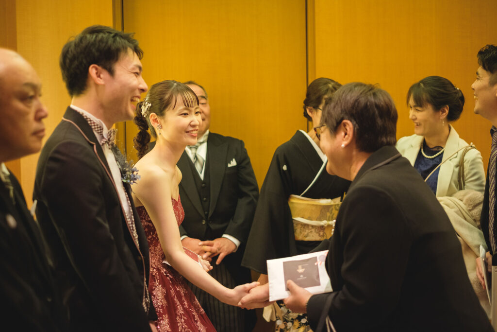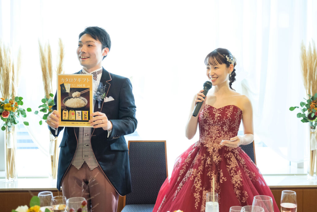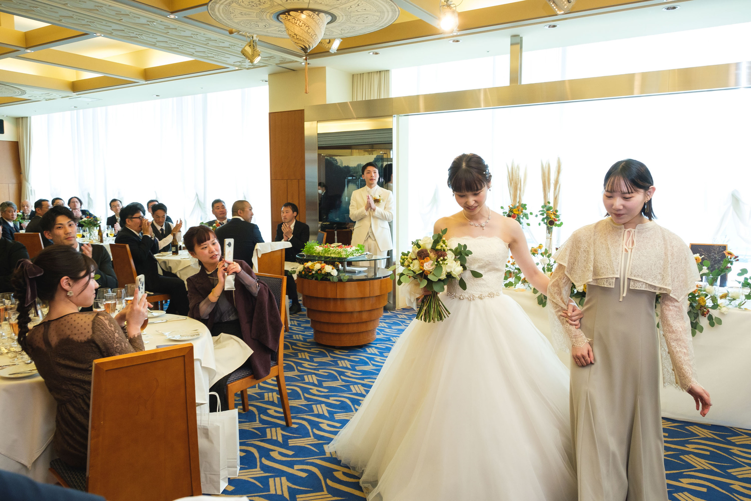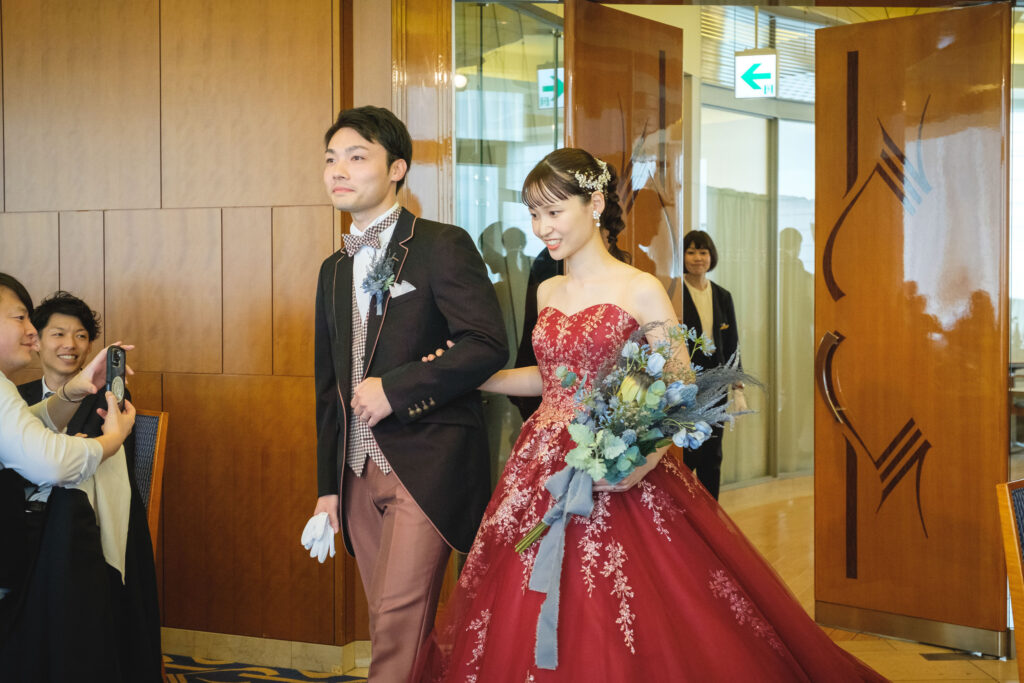 再入場では受付で行って頂いた「ドレス色当てクイズ」の結果発表。鮮やかな赤のドレスで登場したご新婦様に、会場からは大きな歓声が上がりました。 友人代表スピーチでは共に歩んできた時間を思い出し ご新婦様とご友人が涙するシーンも。ご両親へ手作りのフォトフレームに感謝を込めて贈った記念品贈呈。そして当日の様子を撮影し編集した「エンディングシネマ」で会場の心は一つになり 感動の余韻の中でお見送りを迎えました。